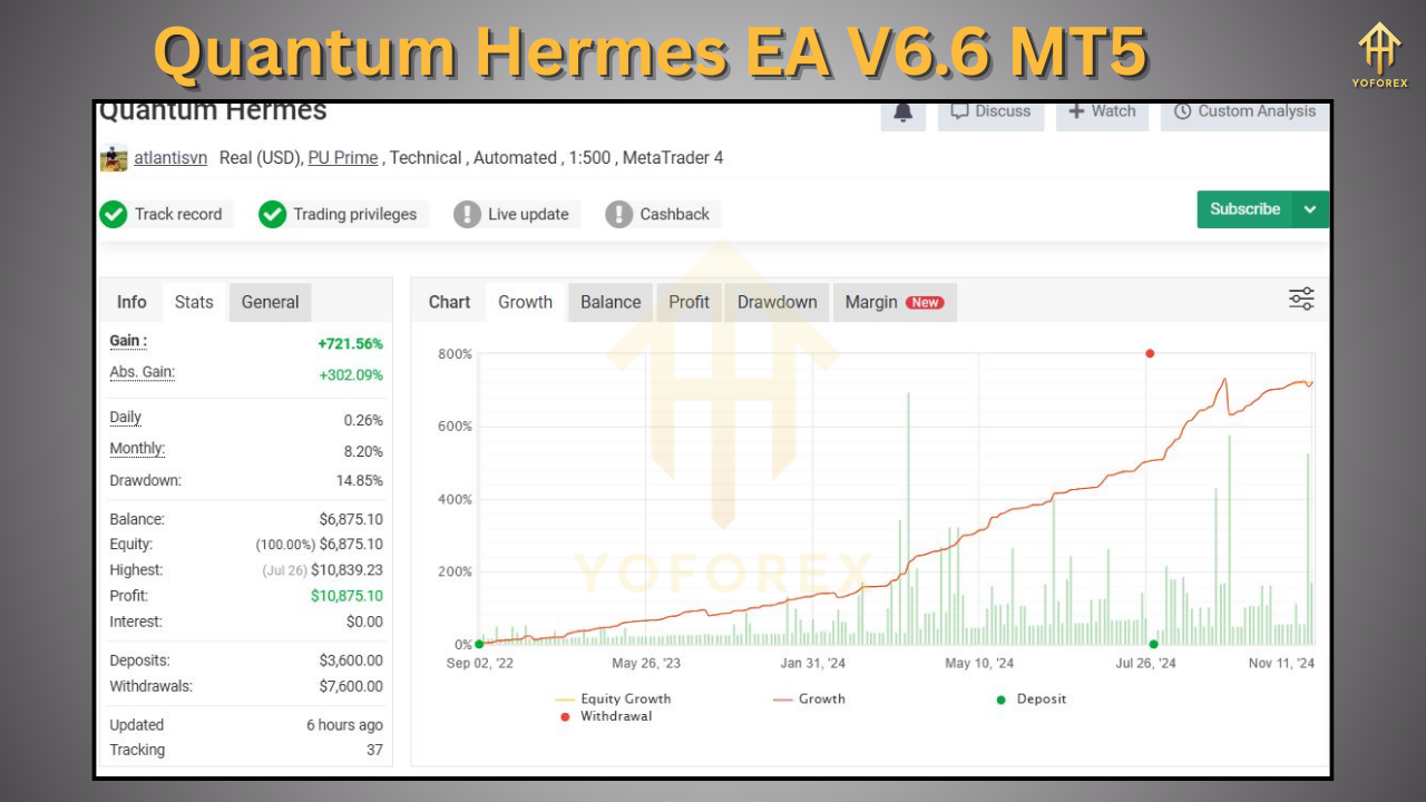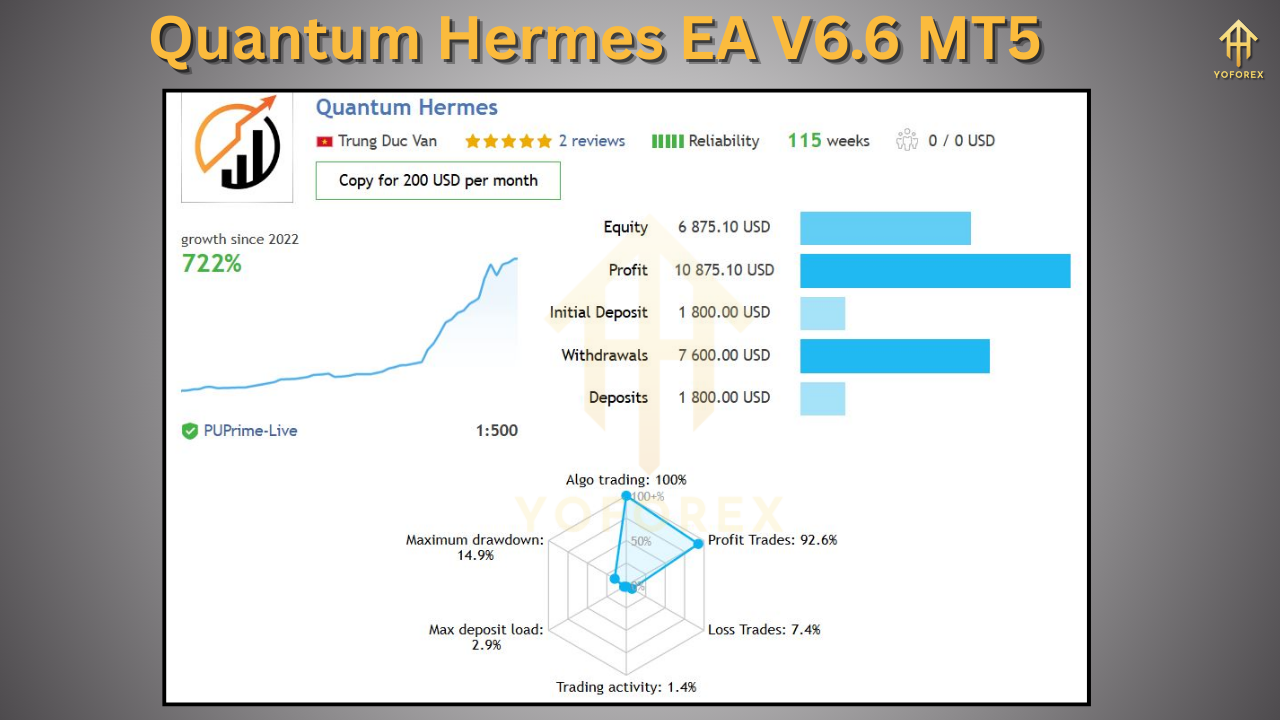 Quantum Hermes EA V6.6 is an Expert Advisor (EA) designed for the MetaTrader 5 (MT5) platform. MT5, the successor of MT4, is a popular trading platform used by forex traders worldwide due to its advanced charting tools, flexible order management, and support for automated trading.