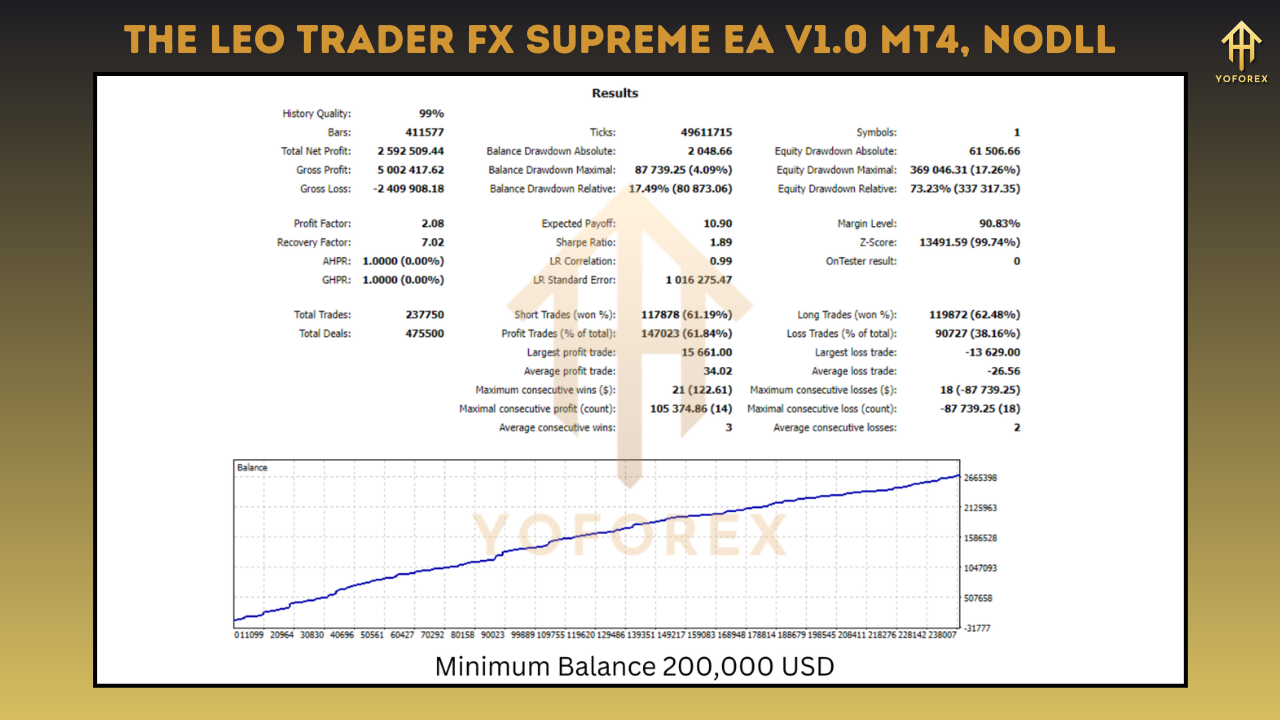 Minimum Deposit: $100 TheLeoTraderFX Supreme EA MT4 requires a minimum deposit of $100 to begin trading. This deposit size ensures that the account has enough margin to open trades and withstand normal market fluctuations. With a lower initial investment, traders can start testing the EA with less financial risk. It’s always advisable to start with a demo account to familiarize yourself with the EA’s strategies and adjust your risk management before going live.
